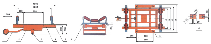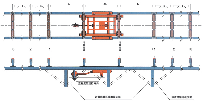 說明:1、測速車及測速傳感器 2、稱重架 3、輔助輥 4、稱重橋 5、原輸送機托輥改制的計量托輥 5、輸送機框架